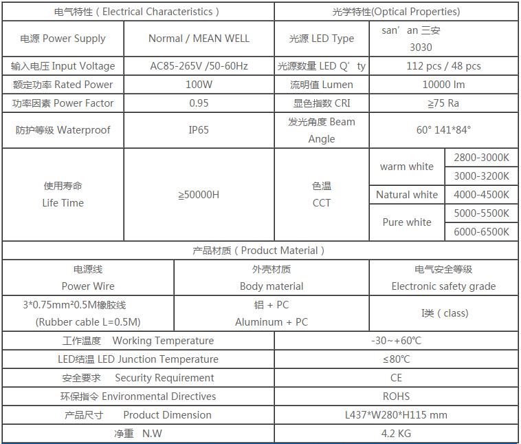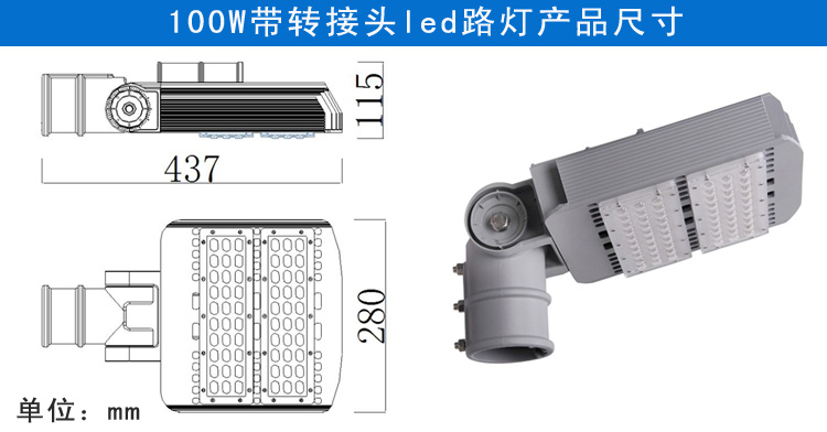 产品特点: 1.灯臂角度可180°调节,照射角度可随意变化 2.采用高亮度LED芯片,亮度高、显色性好 3.铝加工而成,对流散热设计,散热性能好,保障光源使用寿命 4.抗17级风力,无形变、松动等现象,异常牢固 5.防护等级IP65 适用范围: 主干道路、高速公路、高架路、市区街道、天桥、人行道等道路照明,以及广场、学校、住宅区、工业区、公园等其他需要户外照明的场所。 产品规格(Product Spec):PL29L-100W LED路灯