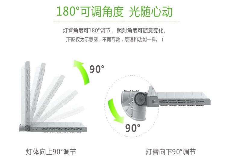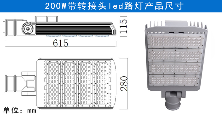 产品特点: 1.灯臂角度可180°调节,照射角度可随意变化 2.采用高亮度LED芯片,亮度高、显色性好 3.铝加工而成,对流散热设计,散热性能好,保障光源使用寿命 4.抗17级风力,无形变、松动等现象,异常牢固 5.防护等级IP65 适用范围: 主干道路、高速公路、高架路、市区街道、天桥、人行道等道路照明,以及广场、学校、住宅区、工业区、公园等其他需要户外照明的场所。 产品规格(Product Spec):PL29L-200W LED路灯